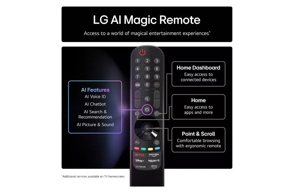 AI makes operation easier than ever- raft of AI technologies make it easier to find just what you’re looking for. Featuring AI Agent, Intelligent Voice Recognition and AI Concierge, you’re offered recommendations that are unique to your viewing habits. For simple interaction with your TV, there’s even an AI Chatbot that can proactively search for solutions to operational challenges you might have.