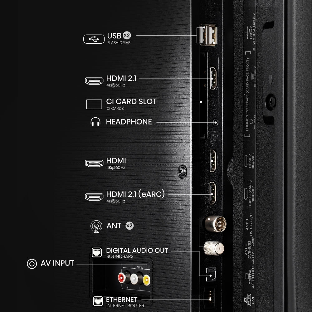 - HDMI 2.1 x 3 (eARC x 1) - Composite x 1 - USB 2.0 x 2 - USB Type-C x 1