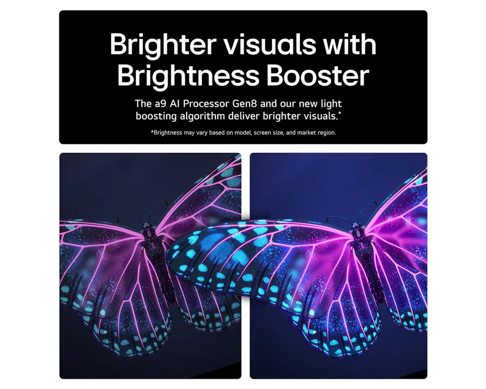 Brightness Booster - LG OLED's iconic self-lit pixels shine brighter than before with the Light Boosting Alogirthm, Light Control Architecture, and other refinements driven by α9 AI Processor 4K Gen6.