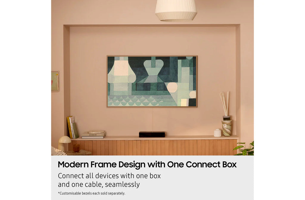 One connect box- just one box and one cable, keeping your space clutter-free and your entertainment seamless. Perfect for a clean, hassle-free wall-mount setup with The Frame TV, creating a sleek, modern look.