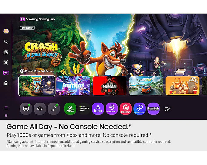 Gaming Hub - Samsung Gaming Hub brings together the biggest console and streaming games from Xbox and other industry-leading partners, all in on one place. With no downloads, storage limits or console required, just turn on your TV and play.