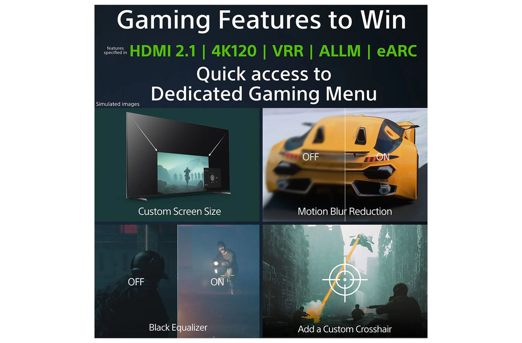 - 4K120 - VRR - ALLM - HDR game mode - Graphics mode - Gaming menu - Crosshair - Black equaliser - Custom Screen Size - Auto HDR Tone Mapping with PlayStation 5 - Auto Genre Picture Mode with PlayStation 5 - Perfect for PlayStation 5 - Gaming apps