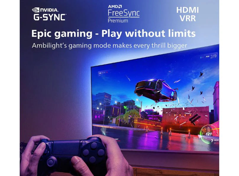 Ultra-low latency gaming - latest HDMI 2.1 connectivity and automatically switches to an ultra-low-latency setting when you start playing a game on your console. VRR and Freesync are supported for smooth fast-action gameplay. Ambilight's gaming mode brings the thrill right into the room.