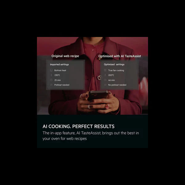 Next-level recipe results with AI- remove any guesswork and enjoy your oven's full capabilities with AI TasteAssist. Simply send a web recipe to your oven via our app and let AI optimise the time, temperature and functions, bringing out the best in every dish.