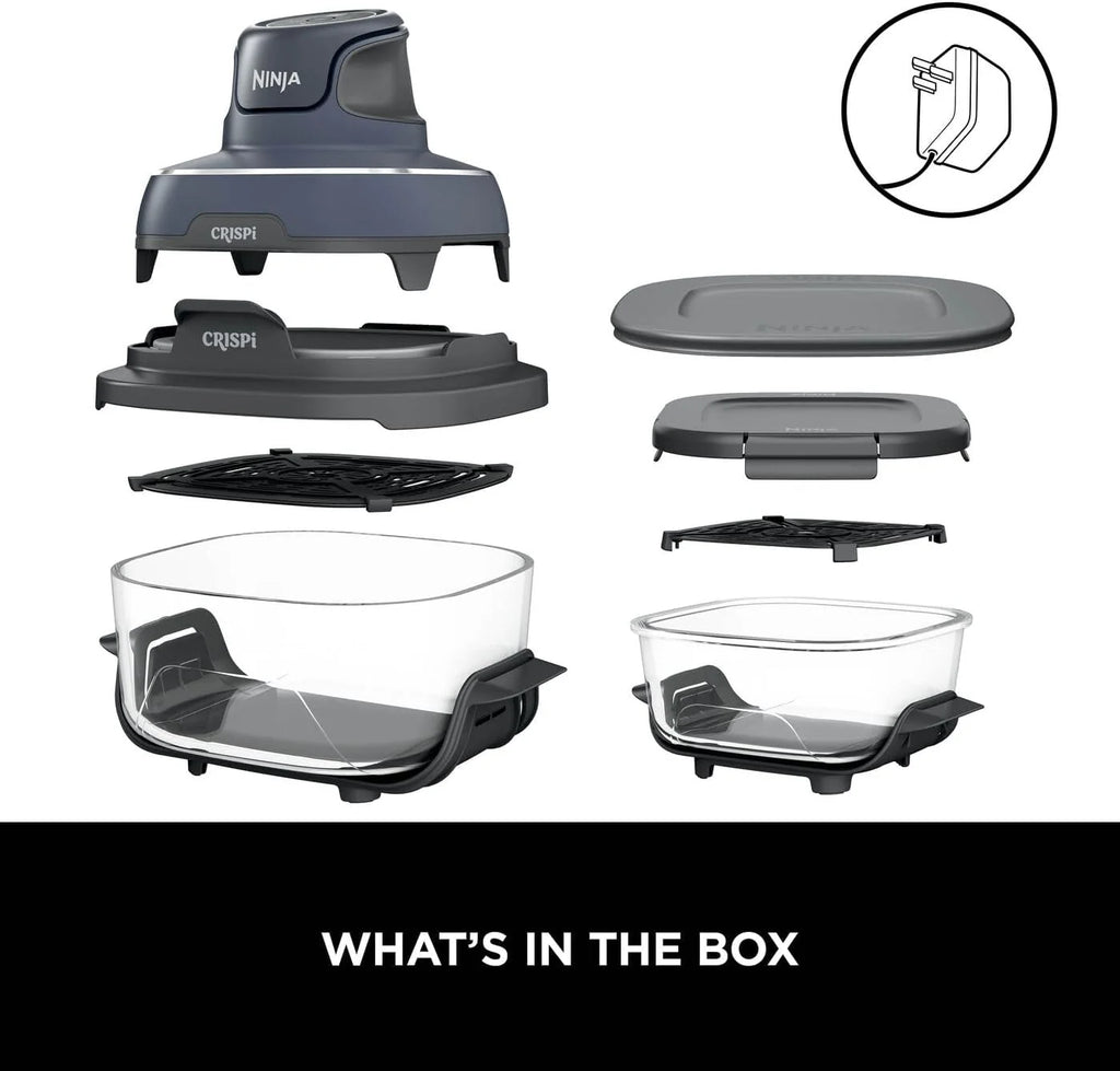 - Ninja Crispi 4-in-1 Portable Glass Air Fryer - Glass Containers x 2 - Adaptor - Large Crisper Plate - Small Crisper Plate - Large Lid