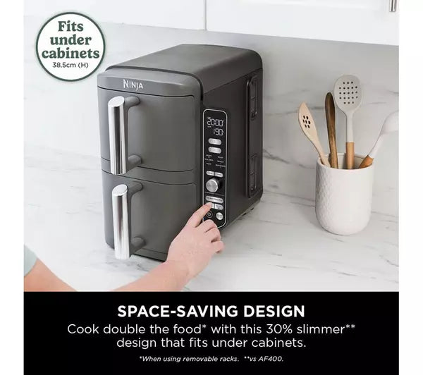 Slim design- With two cooking drawers stacked on top of each other, this compact double air fryer is 30% slimmer, without compromising on capacity. Perfect for small kitchens, large families, and anyone who loves entertaining a crowd, fitting enough food for up to 8 people. At 38.5cm tall, it’s designed to fit under cabinets.